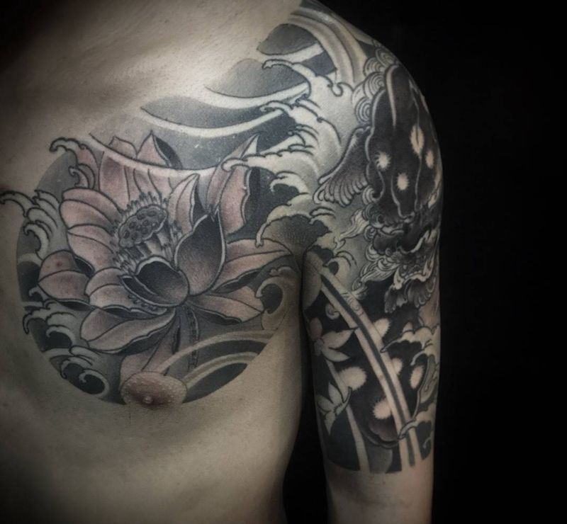 传统唐狮子半甲纹身图片_成品手臂肩部胸部传统动物植物纹身图案