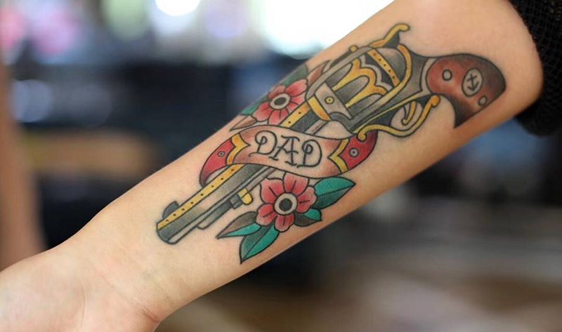 当前位置: 首页 >黑龙江省哈尔滨市纹身店-V刺tattoo纹身图案>school枪花纹身图片_手臂Old School纹身图案