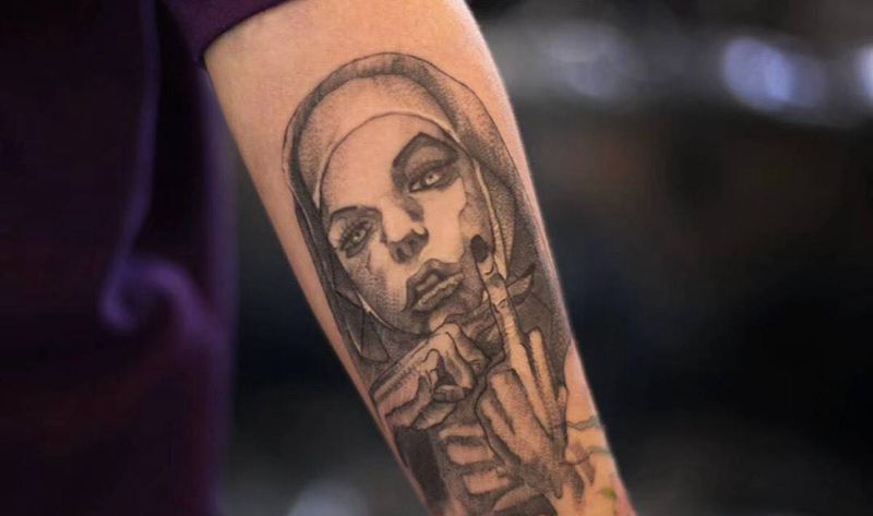 当前位置: 首页 >黑龙江省哈尔滨市纹身店-V刺tattoo纹身图案>修女纹身图片_手臂点刺欧美写实纹身图案