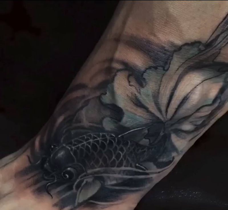 金鱼纹身图片_脚部新传统欧美写实纹身图案