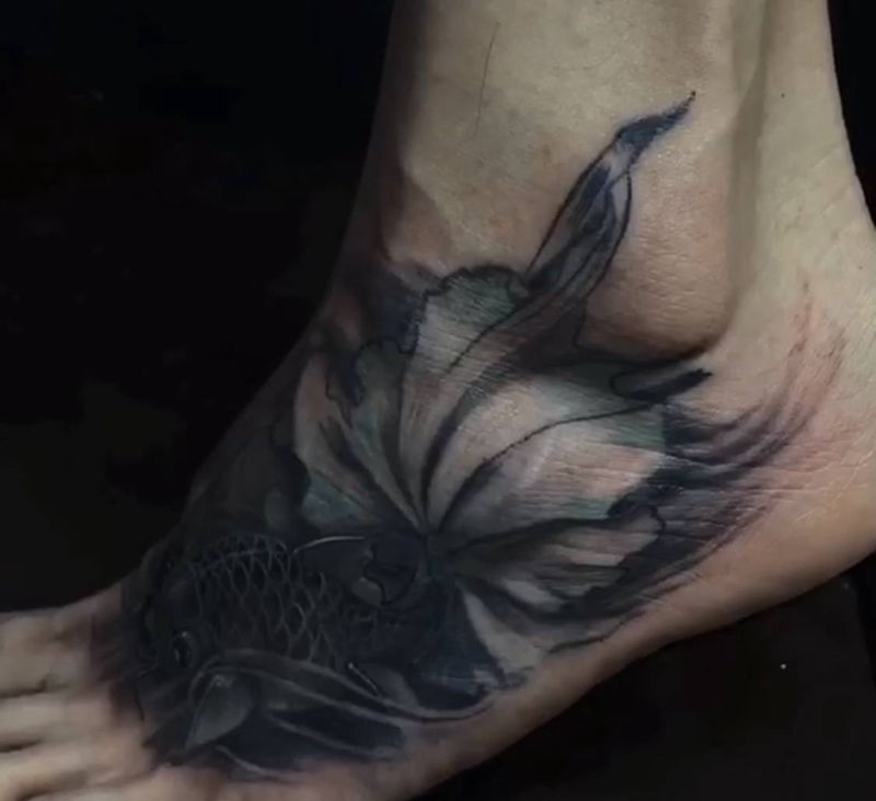 金鱼纹身图片_脚部新传统欧美写实纹身图案