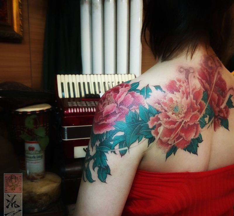 当前位置: 首页 >黑龙江省哈尔滨市纹身店-沉墨刺青纹身图案>牡丹纹身图片_肩部手臂新传统纹身图案
