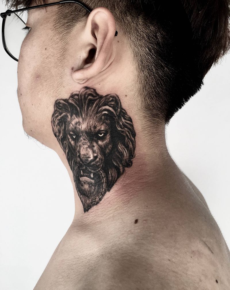 颈部狮子纹身图片_颈部纹身图案