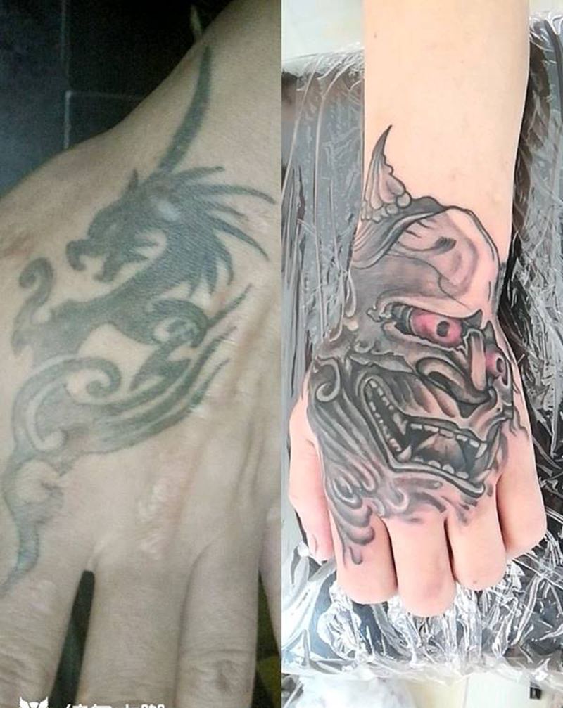 失败纹身遮盖纹身图片_手臂手部传统鬼神成品纹身图案