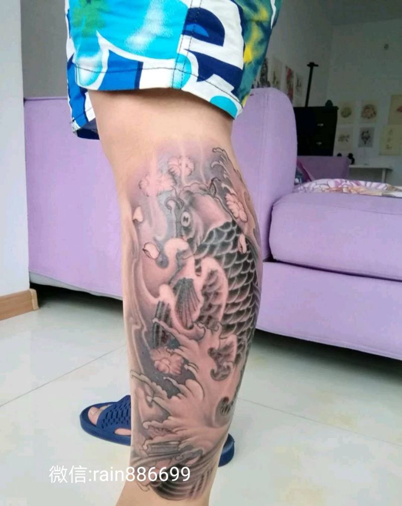 富富有余纹身图片_腿部国画动物成品纹身图案