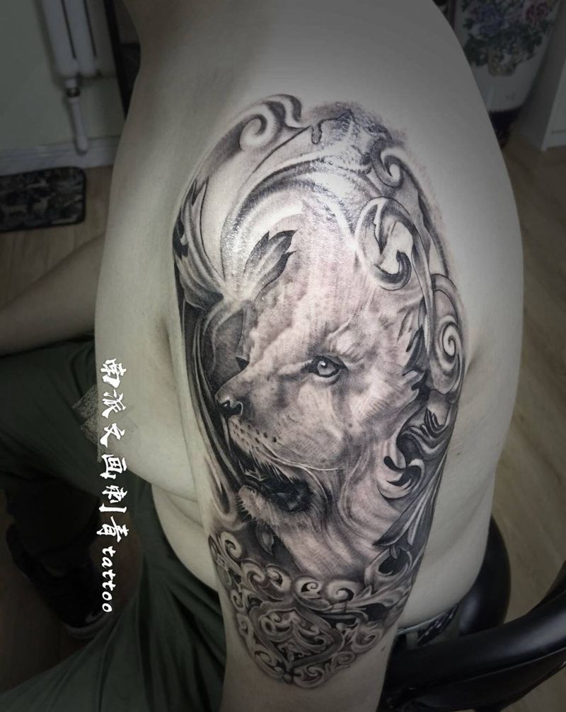 当前位置: 首页 >黑龙江省哈尔滨市纹身店-南派文画刺青纹身图案>雄狮纹身图片_成品手臂欧美动物原创纹身图案