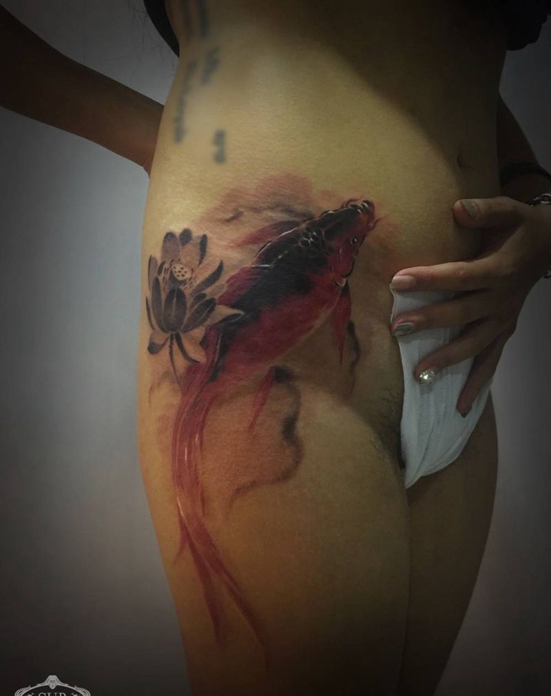 水墨龙凤鲤纹身图片_成品腿部臀部腰部腹部传统国画原创植物动物纹身图案
