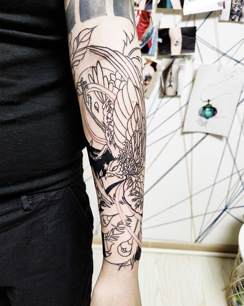 凤凰-割线(未完成)纹身图片_手臂老传统新传统凤凰菊花纹身图案