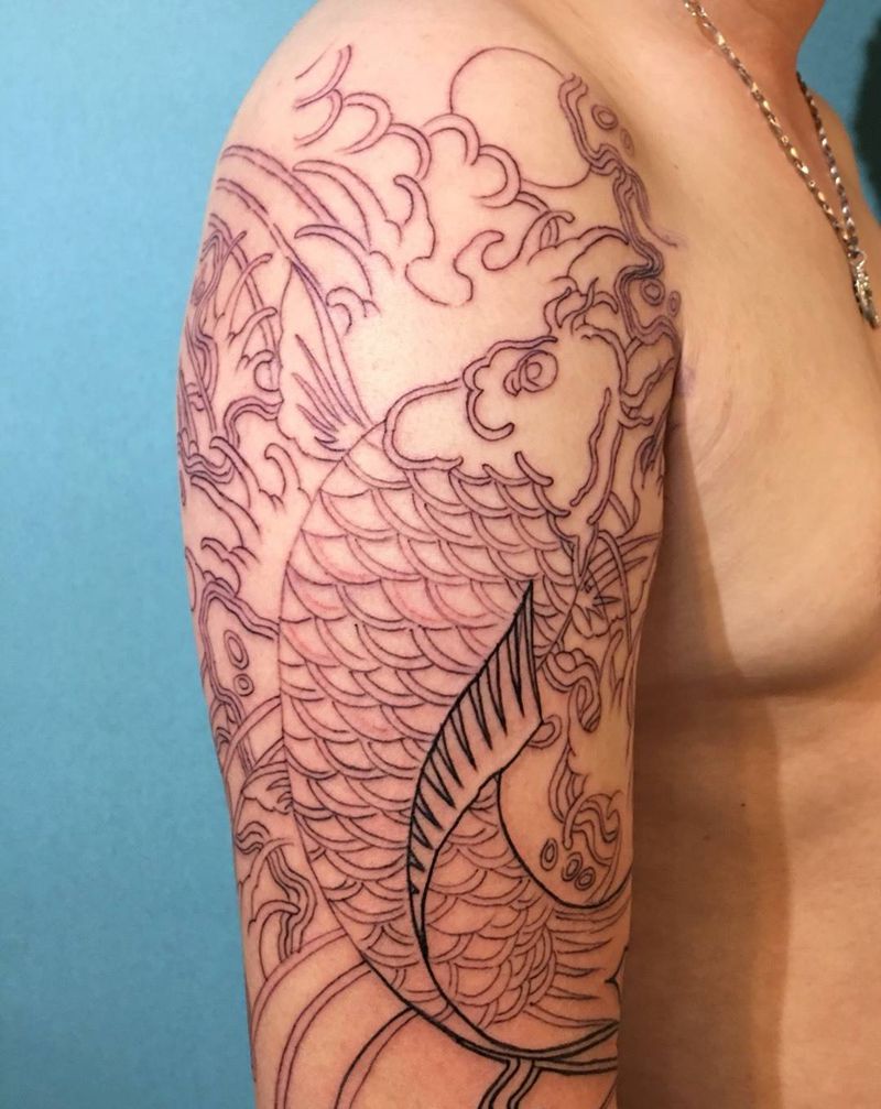 未完成招财鲤鱼纹身图片_手臂老传统鲤鱼招财花臂鱼纹身图案