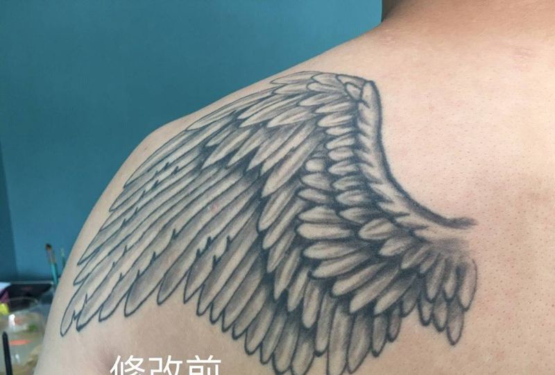 修改纹身作品(黑与白)纹身图片_肩部背部几何点刺羽毛翅膀修改遮盖纹身图案
