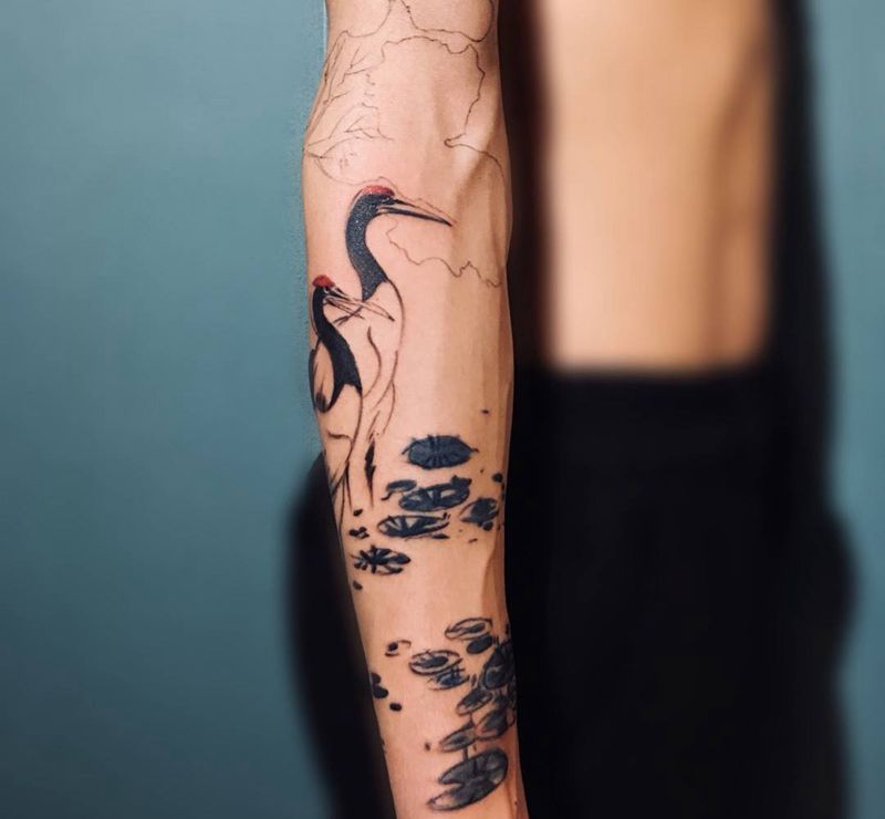 未完成纹身图片_手臂水彩水墨中式风格写意仙鹤纹身图案