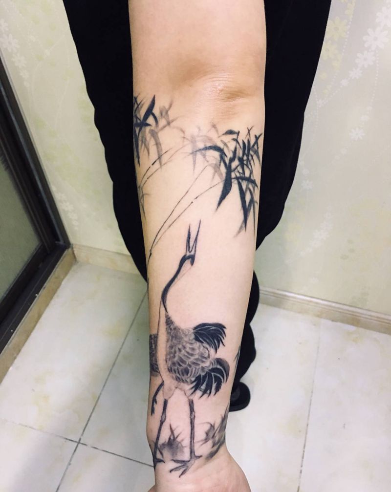 情侣竹子纹身图片_手臂水墨情侣竹子仙鹤纹身图案