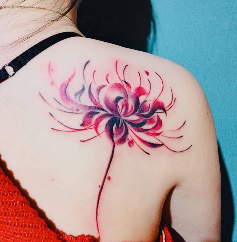 彼岸花纹身图片_背部肩部水墨花彼岸花纹身图案