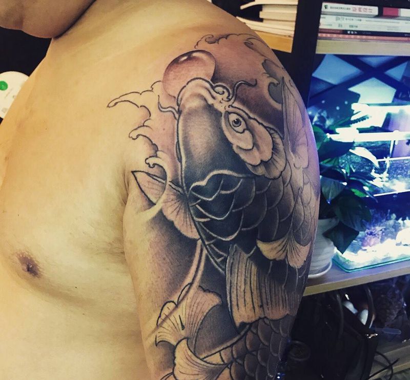 大鲤鱼纹身图片_成品手臂肩部传统原创动物纹身图案
