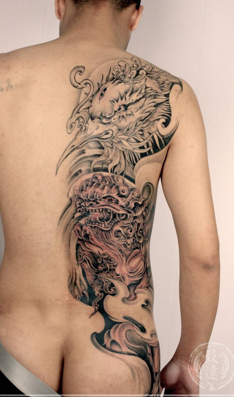 凤凰唐狮纹身图片_成品臀部背部腰部传统动物原创纹身图案