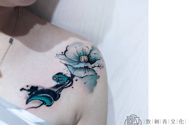 罂纹身图片_肩部胸部水彩水墨纹身图案