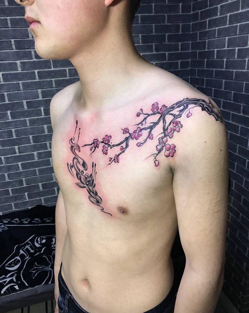 桃花运!纹身图片_成品胸部传统国画植物纹身图案
