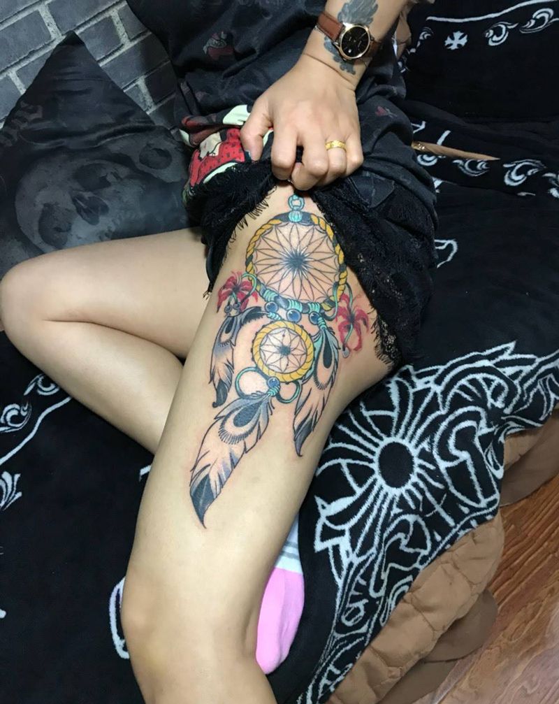 捕梦来世今生纹身图片_腿部成品纹身图案