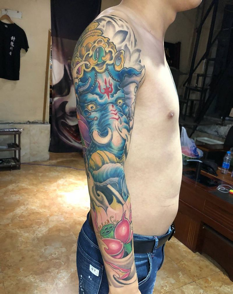当前位置: 首页 >黑龙江省齐齐哈尔市纹身店-针鬼刺青纹身图案>花臂象神纹身图片