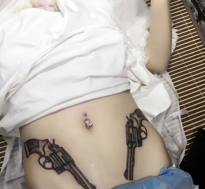 当前位置: 首页 >黑龙江省大庆市纹身店-龙啸堂纹身纹身图案>美女的双枪和脐钉纹身图片