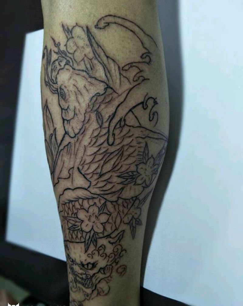 当前位置: 首页 >黑龙江省大庆市纹身店-刺夢·Tattoo紋身工作室纹身图案>小腿鲤鱼加唐狮。纹身图片