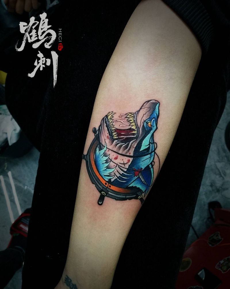 当前位置: 首页 >黑龙江省鸡西市纹身店-鹤刺青纹身图案>小蓝鲨纹身图片_手臂New School纹身图案