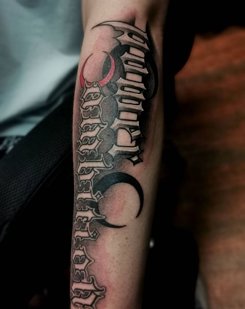 当前位置: 首页 >黑龙江省大庆市纹身店-極-刺青TATTOO纹身图案>原创花体字纹身图片_手臂New School花体字纹身图案