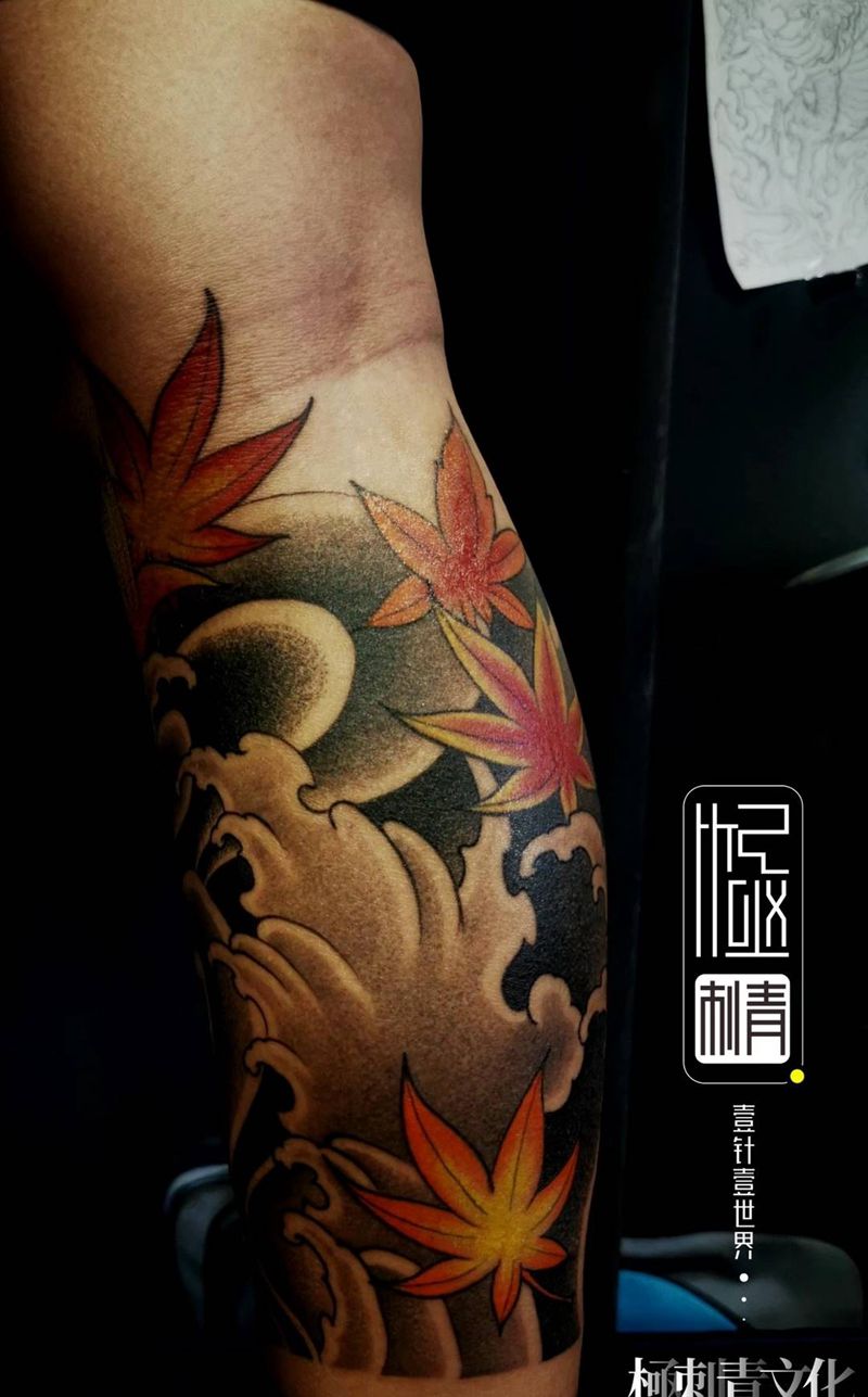 日式点刺包小腿纹身图片_腿部老传统新传统纹身图案