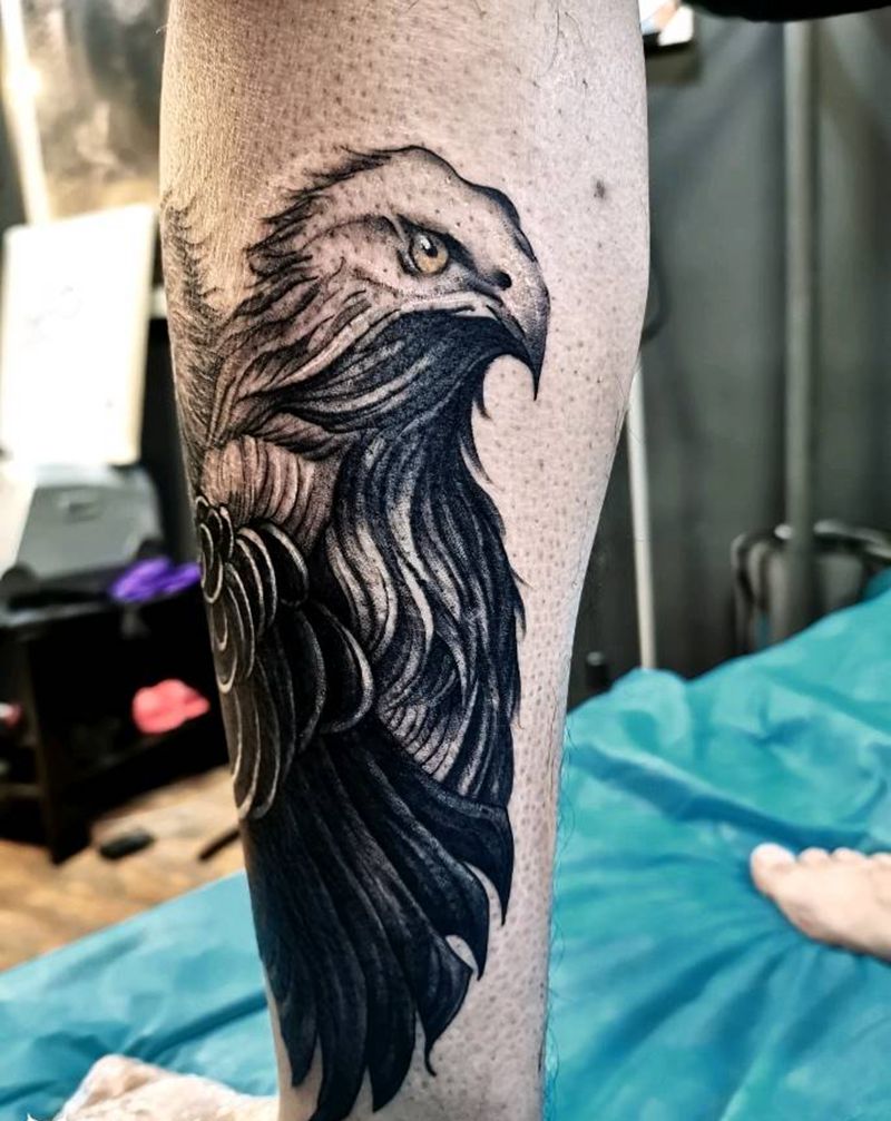 双头鹰遮盖纹身图片_腿部新传统欧美写实老鹰遮盖鹰纹身图案