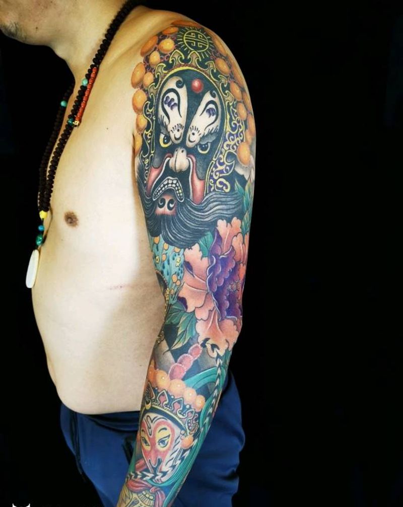 生旦净丑纹身图片_手臂老传统新传统人物霸王花臂纹身图案