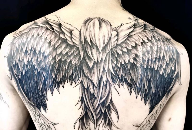 满背翅膀纹身图片_背部肩部新传统欧美写实翅膀满背黑灰纹身图案