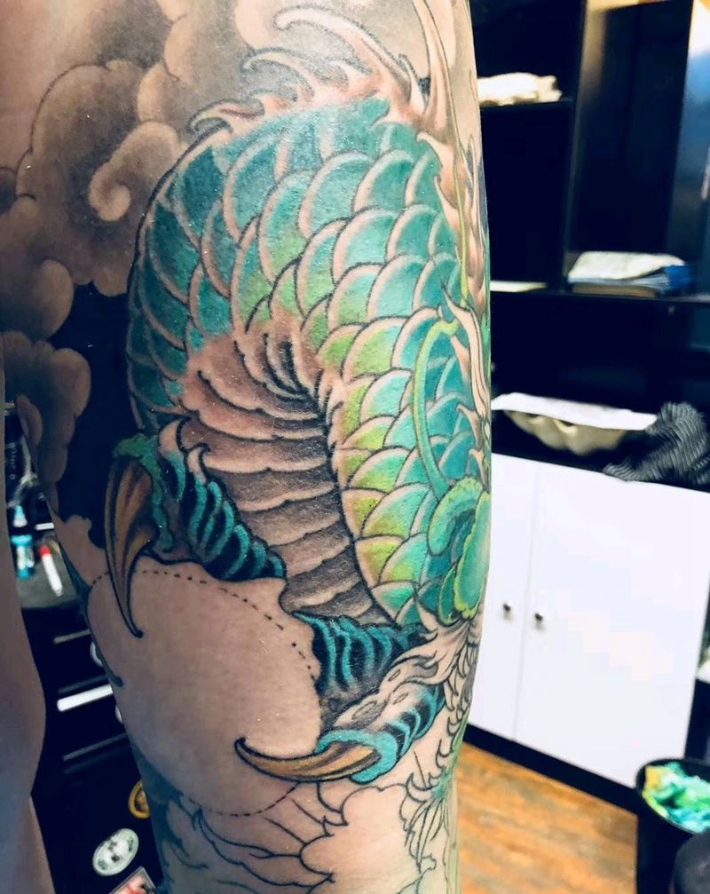 • T网红王老大花腿龙纹身图片_腿部新传统纹身图案