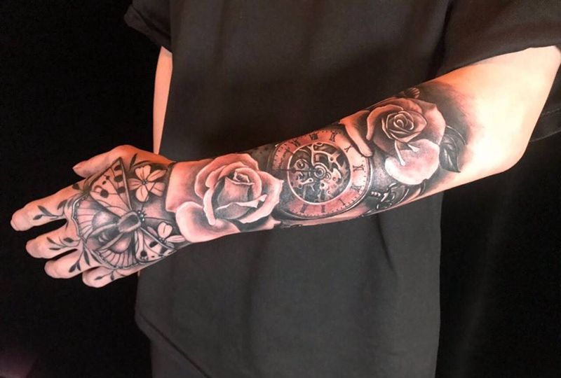 当前位置: 首页 >上海市纹身店-上海大武刺青工作室纹身图案>玫瑰时钟蝴蝶纹身图片
