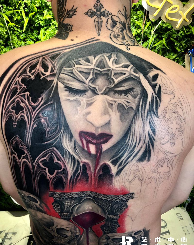 修女骷髅未完成纹身图片_背部欧美写实纹身图案