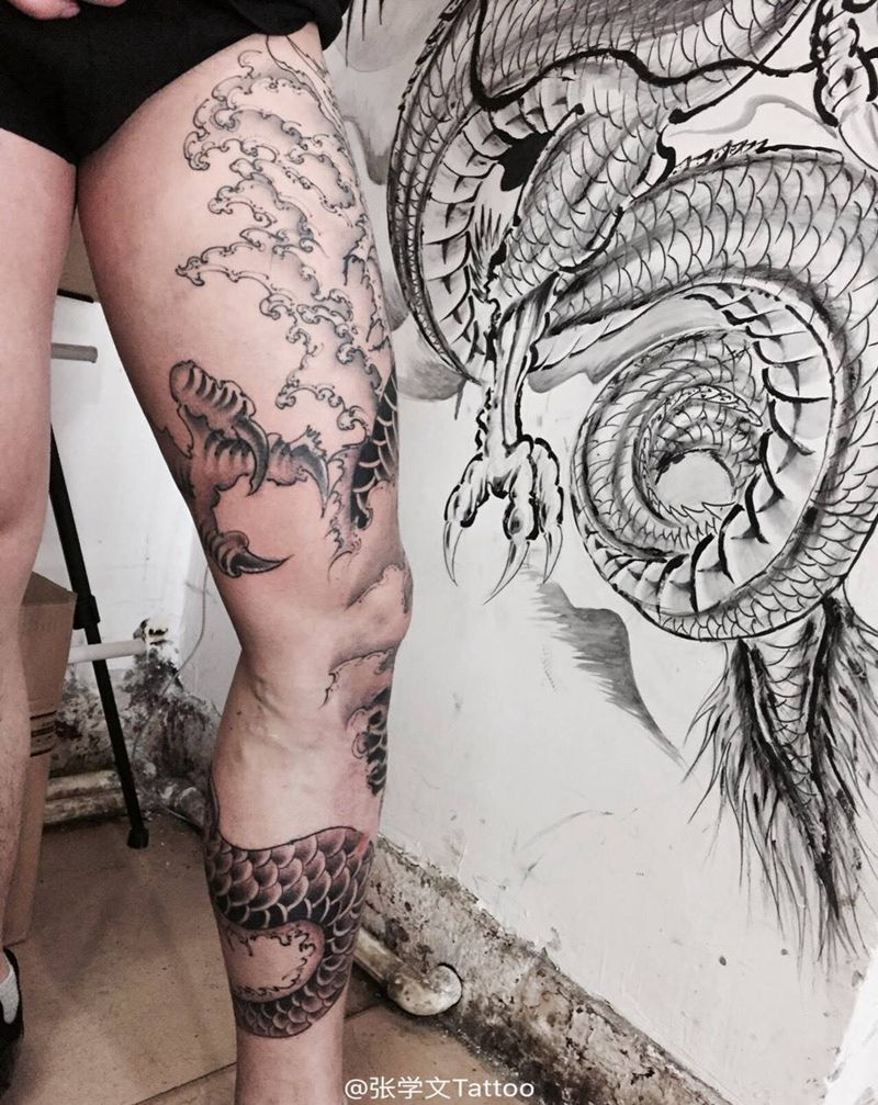 • T网红王老大花腿龙纹身图片_腿部新传统纹身图案
