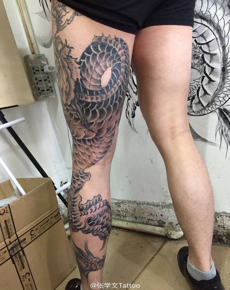 • T网红王老大花腿龙纹身图片_腿部新传统纹身图案