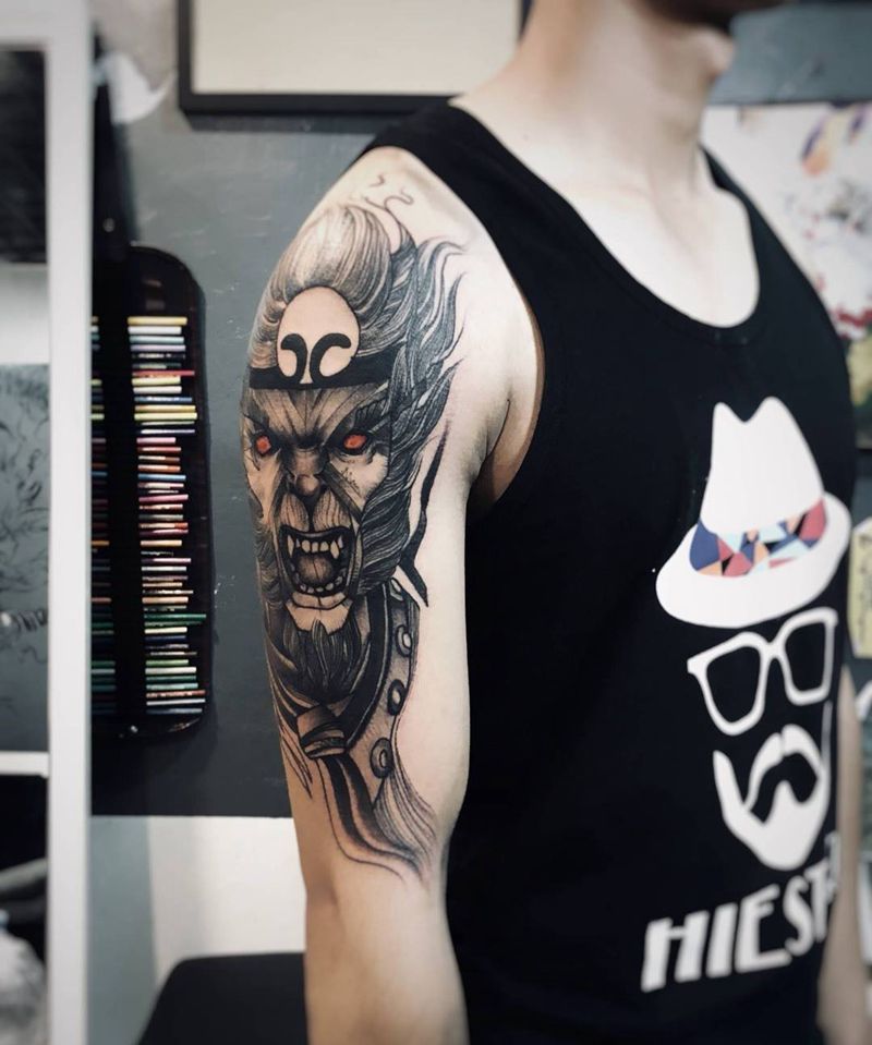 当前位置: 首页 >黑龙江省佳木斯市纹身店-九霄刺青TATTOO纹身图案>斗战神纹身图片_鬼神人物动物习俗传统清新写实手臂肩部成品纹身图案