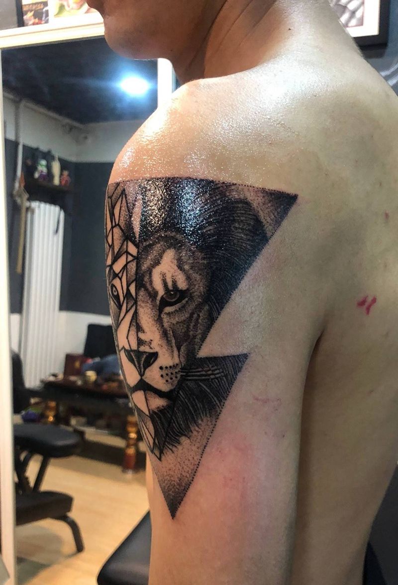 当前位置: 首页 >黑龙江省佳木斯市纹身店-九霄刺青TATTOO纹身图案>无ps 几何点刺狮子纹身图片_动物几何图腾清新传统写实肩部手臂成品纹身图案