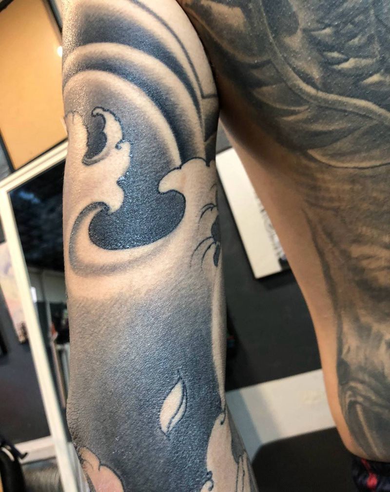 当前位置: 首页 >黑龙江省佳木斯市纹身店-九霄刺青TATTOO纹身图案>无ps恢复后水浪花臂纹身图片_原创传统手臂成品纹身图案