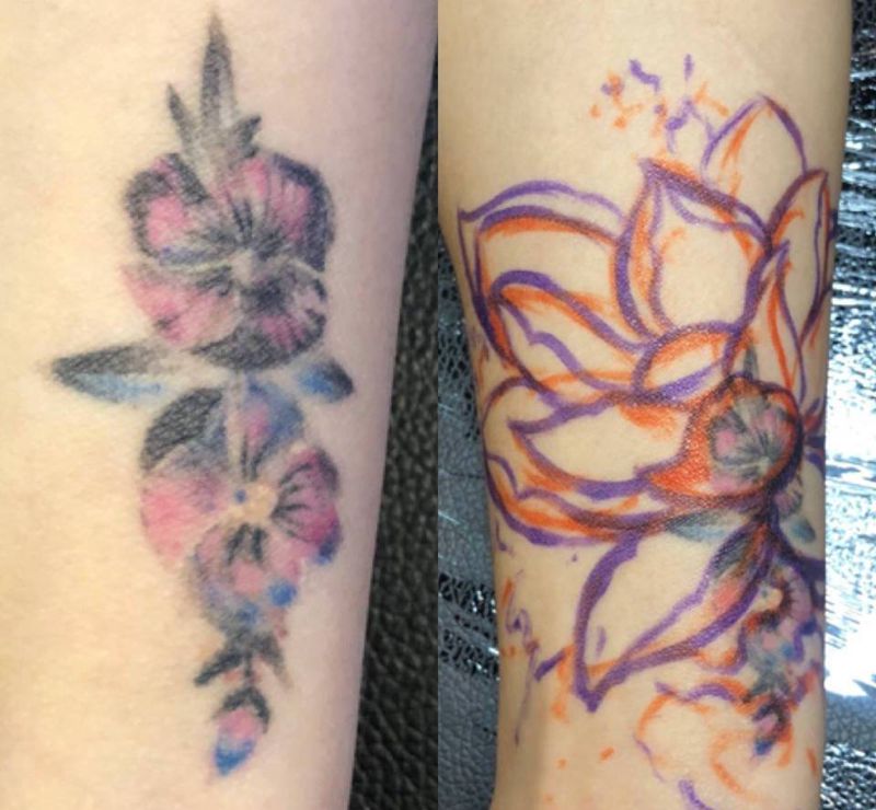 水彩荷花(遮盖作品)纹身图片_植物清新手臂成品纹身图案