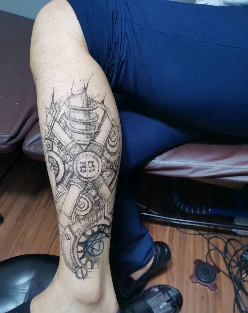 X机械纹身图片_腿部脚部欧美写实机械纹身图案