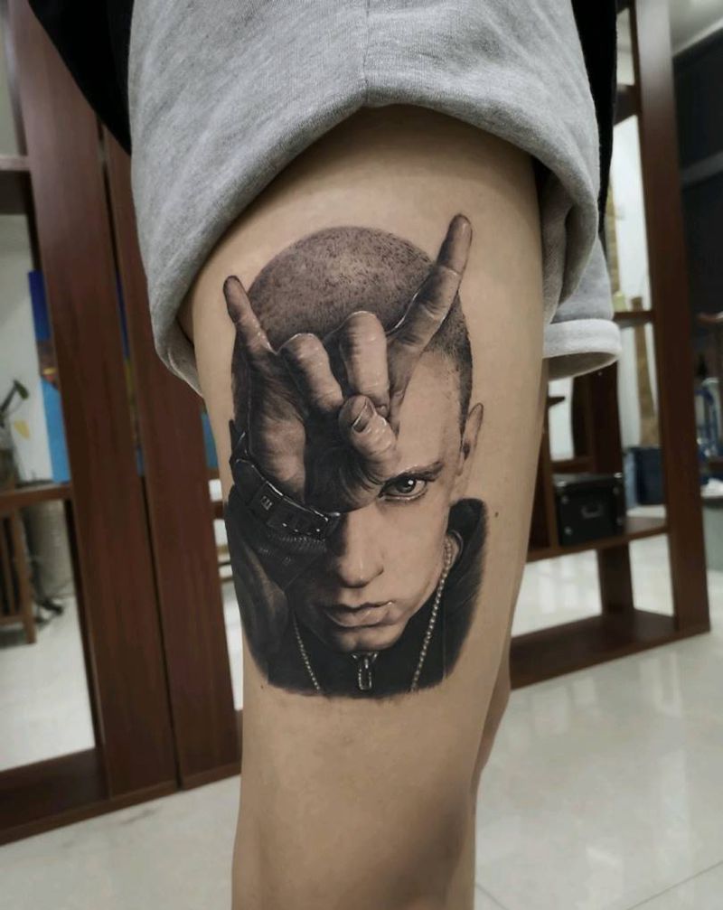 肖像,欧美,黑灰纹身图片_腿部欧美写实黑灰肖像纹身图案