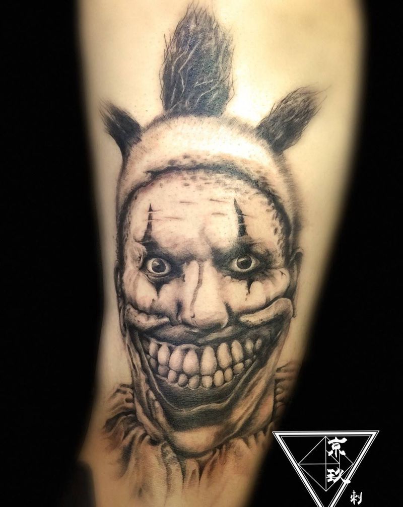 当前位置: 首页 >黑龙江省牡丹江市纹身店-京玖刺青工作室纹身图案>美恐小丑纹身图片_成品腿部欧美肖像写实鬼神纹身图案