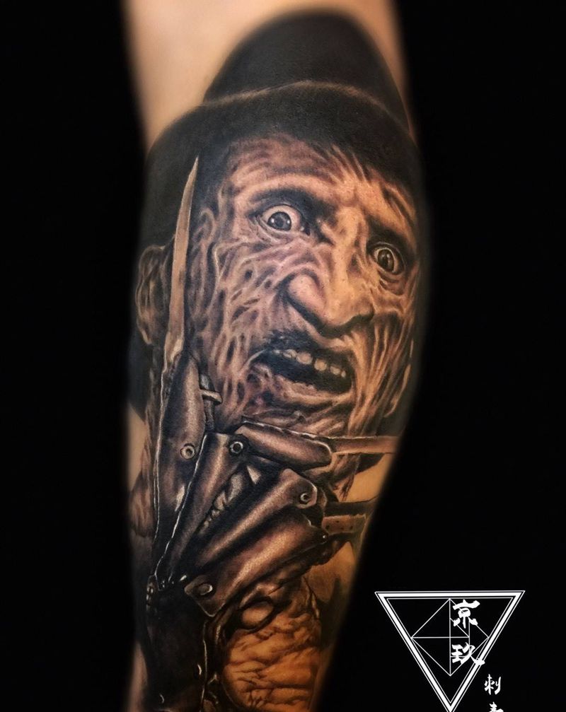当前位置: 首页 >黑龙江省牡丹江市纹身店-京玖刺青工作室纹身图案>猛鬼街纹身图片_成品腿部欧美肖像写实人物鬼神纹身图案