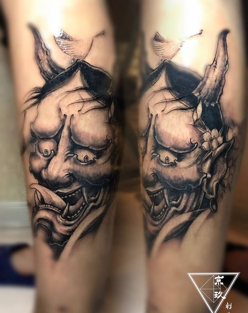般若纹身图片_成品腿部传统鬼神纹身图案
