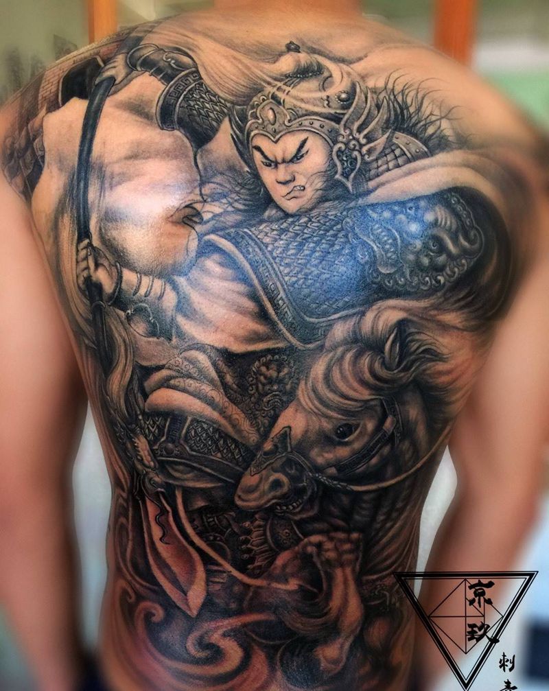 赵云纹身图片_成品背部传统人物遮盖纹身图案