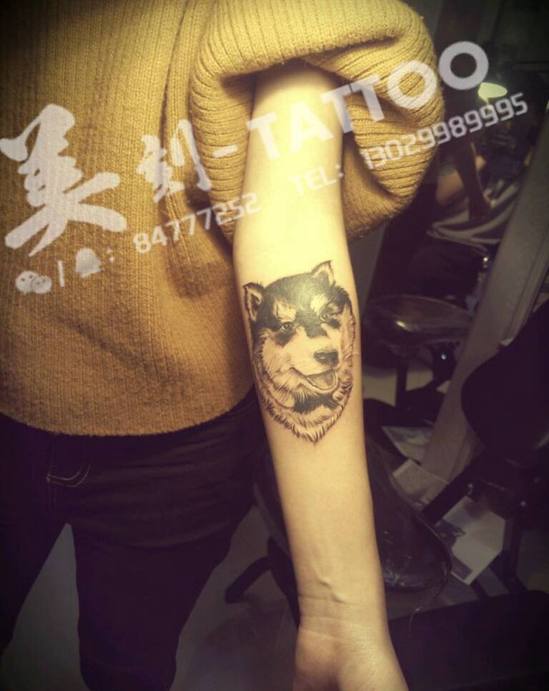 当前位置: 首页 >黑龙江省佳木斯市纹身店-美刻刺青纹身图案>美女的阿拉斯加爱犬!臭臭纹身图片_手臂欧美写实动物成品纹身图案