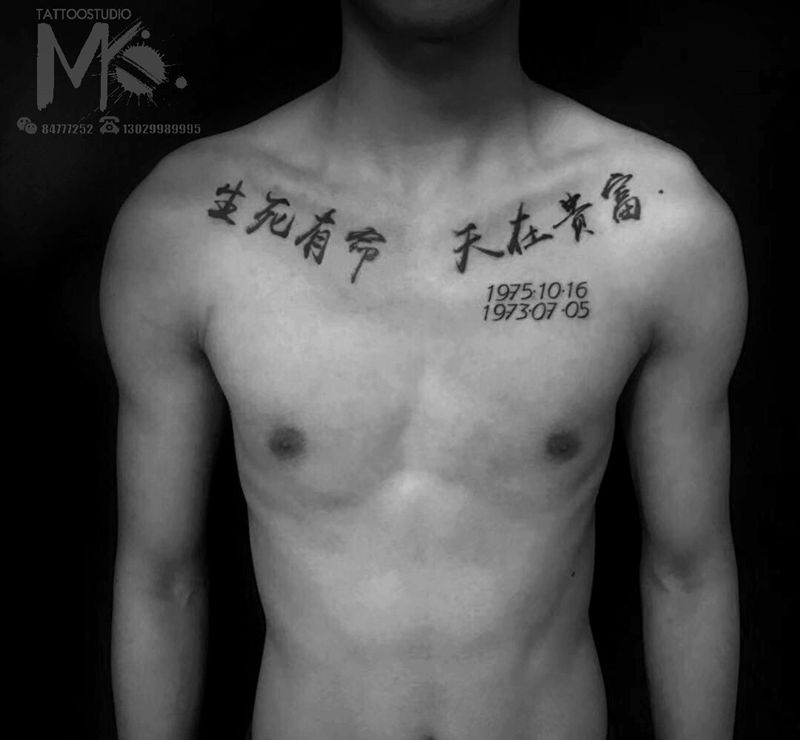当前位置: 首页 >黑龙江省佳木斯市纹身店-美刻刺青纹身图案>生死有命富贵在天纹身图片_胸部背部花体字水墨纹身图案