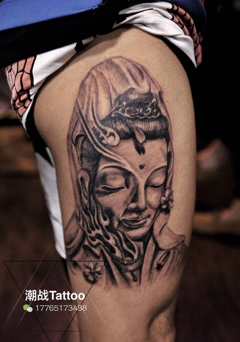 观音纹身图片_成品腿部传统写实人物纹身图案