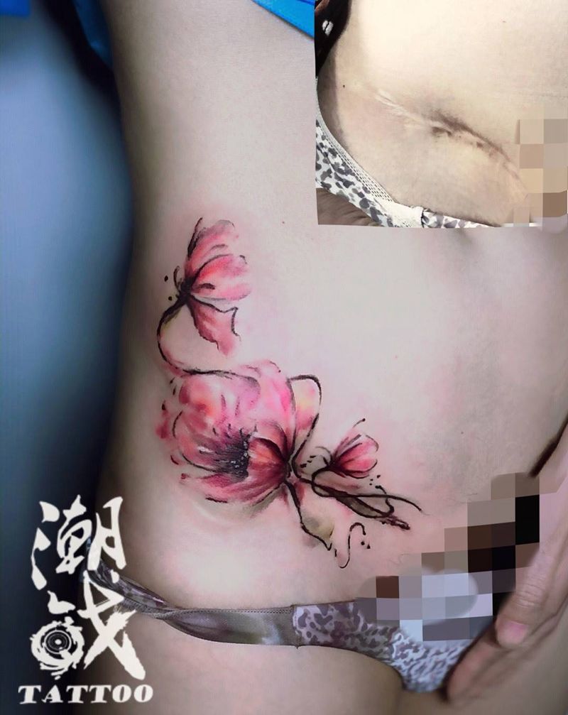 疤痕遮盖纹身图片_腹部水墨遮盖花纹身图案